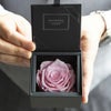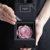ダイヤモンドローズボックスは、すべてフランス・パリ製の最高級ローズパフュームリボンで包装されています。到着した瞬間、上質なローズの香りが漂い、アイテムへの期待感を演出します。このリボンには生地にローズパフュームがマイクロカプセルで埋め込まれており、一年以上の長期にわたり、ローズの香りを放ち続けます(香りが弱まった場合は、摩擦により復活します)。