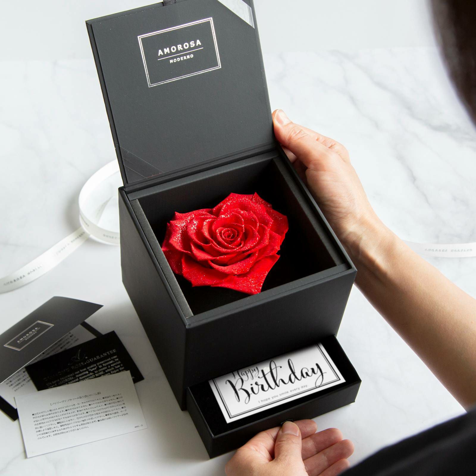 メッセージカードや、ダイヤモンドローズのギャランティーカード(証明書)、取扱説明カードなど、ダイヤモンドローズに添えられた様々なカード類を大切にしまっておけるように、ボックスに引き出しを付けました。