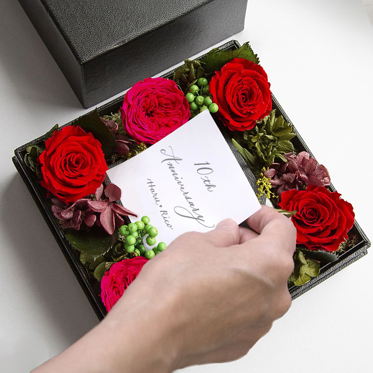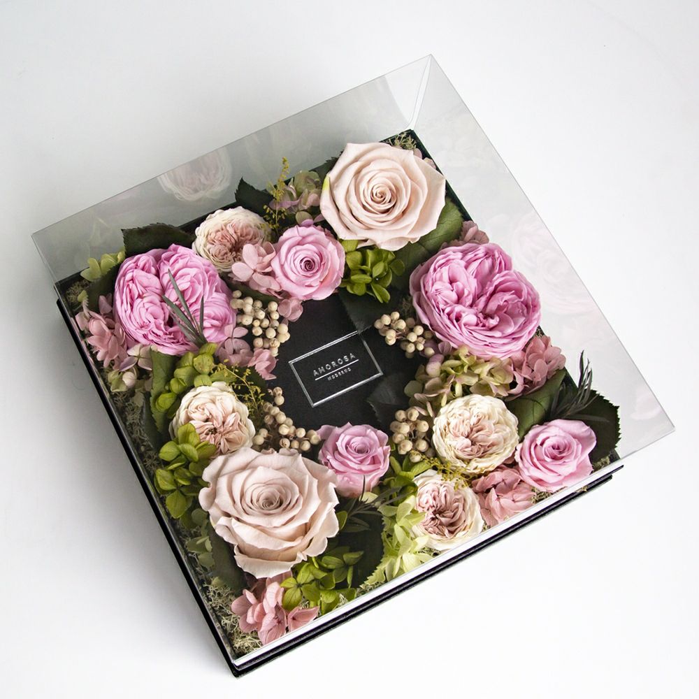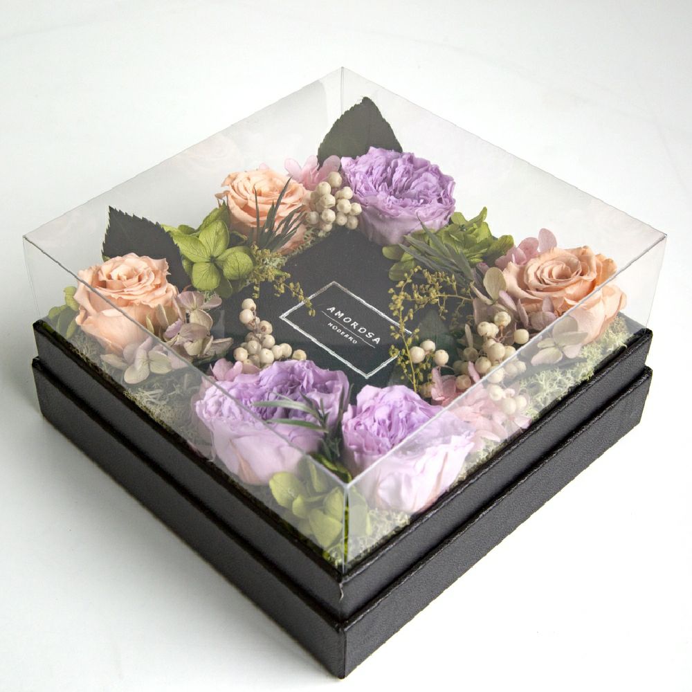 フタを開けた時の驚きが目に浮かぶような、ギフトに最適のボックスアレンジ。「グロリアス」は中央のスクエア部分にカードや写真などをセットすることができます。輝ける日の思い出を花々とともに。
