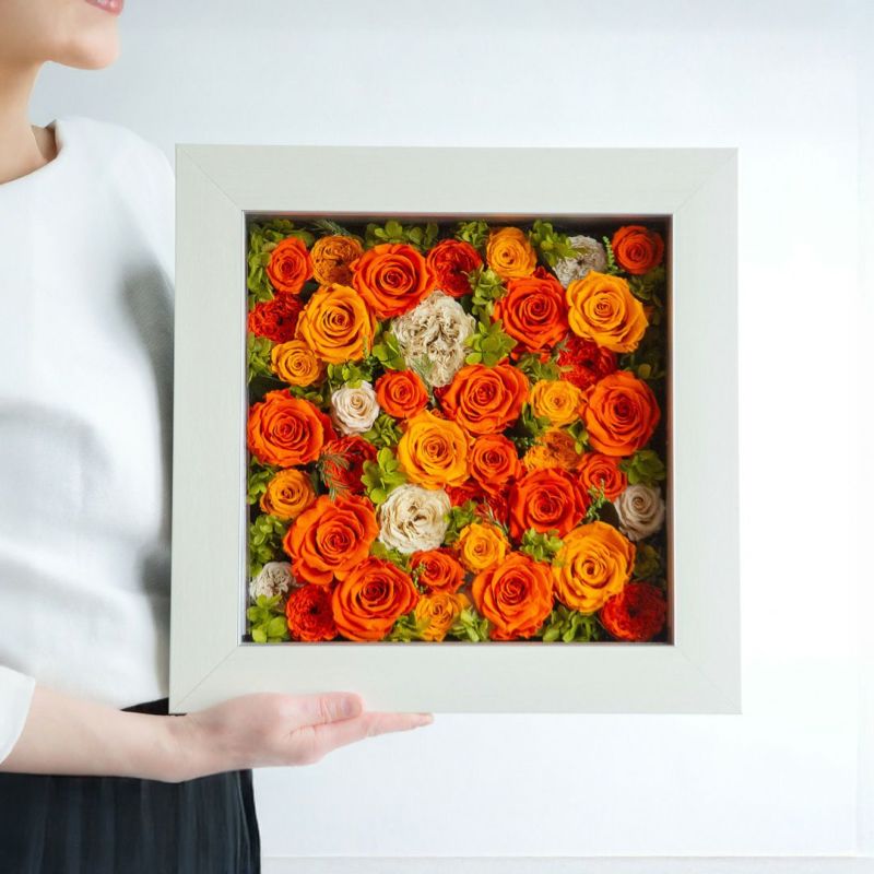 MATERIAL:プリザーブドフラワー(ローズ、アジサイ、グリーン)/フレーム(アルミ複合板、MDF、透明アクリル、吊り金具、吊り紐、直掛け用ビス付き/日本製)