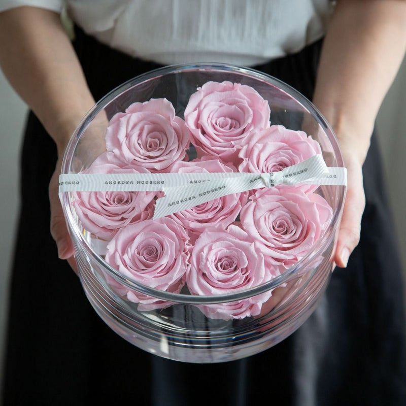 Material:プリザーブドフラワー(ローズ)、真鍮、有機ガラス、(容器)、アクリル(フタ)、リボン、化粧箱