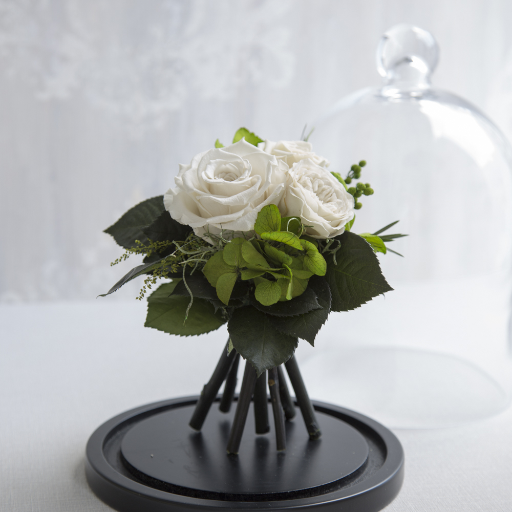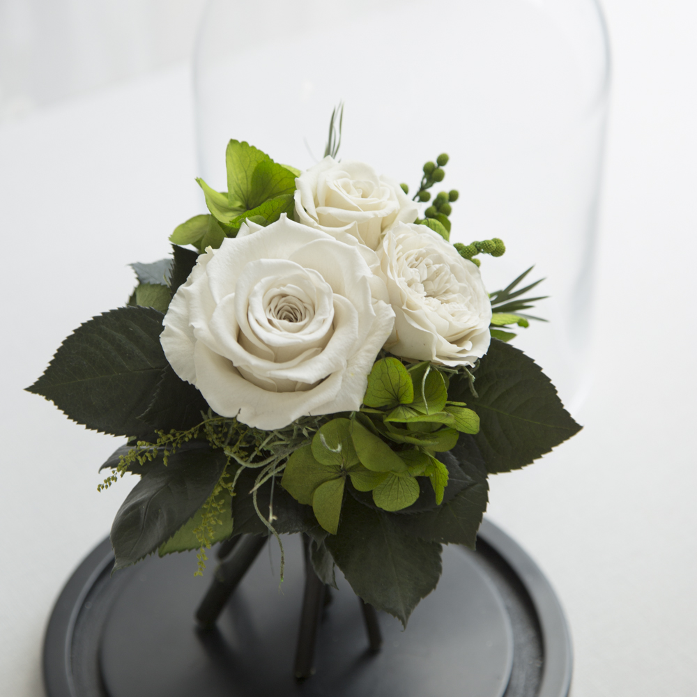 摘みたてのローズをみずみずしいままに、ガラスドームに閉じ込めました。