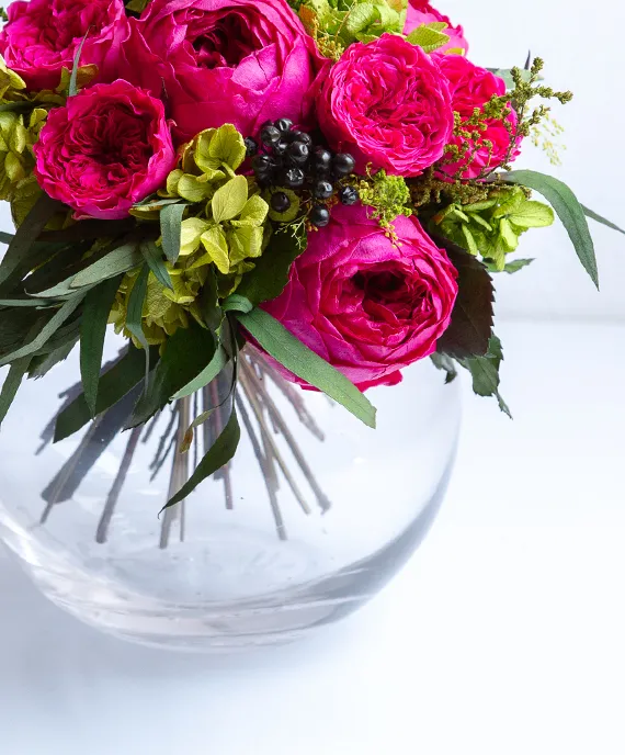 いそがしい母親の誕生日には、花びんつき花束「イヴ」がおすすめ。庭から摘んできたようないきいきとした花束なのに、水換えや傷んだ葉の掃除、茎の切り戻しなどのお手入れは一切不要!さらにガラスの花びんも花束と一緒にお届けします。