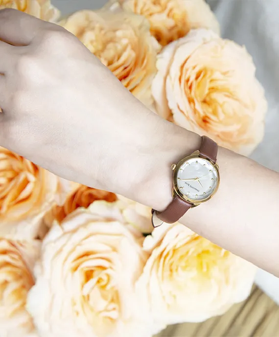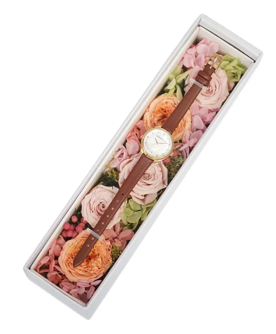 この上質でシンプルな腕時計は、彼女の手元を華やかに彩り、時間を美しく飾ります。時計を見るたびに彼女の日常は、あたたかな愛情に満ちた特別な日々に変わることでしょう。