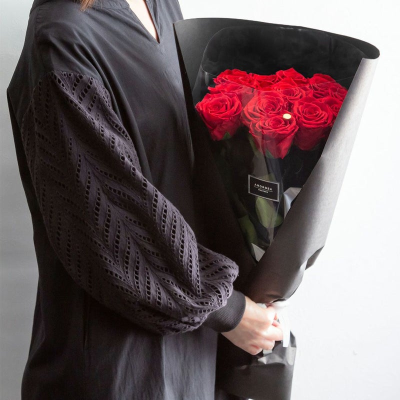 AMOROSA MODERNOが展開する「ダーズンローズ」シリーズは、全てプリザーブドローズ「AMOROSA」を使用しています。贈る時の貴い想い、贈られた時の感動と喜びを形として残しておくことができます。