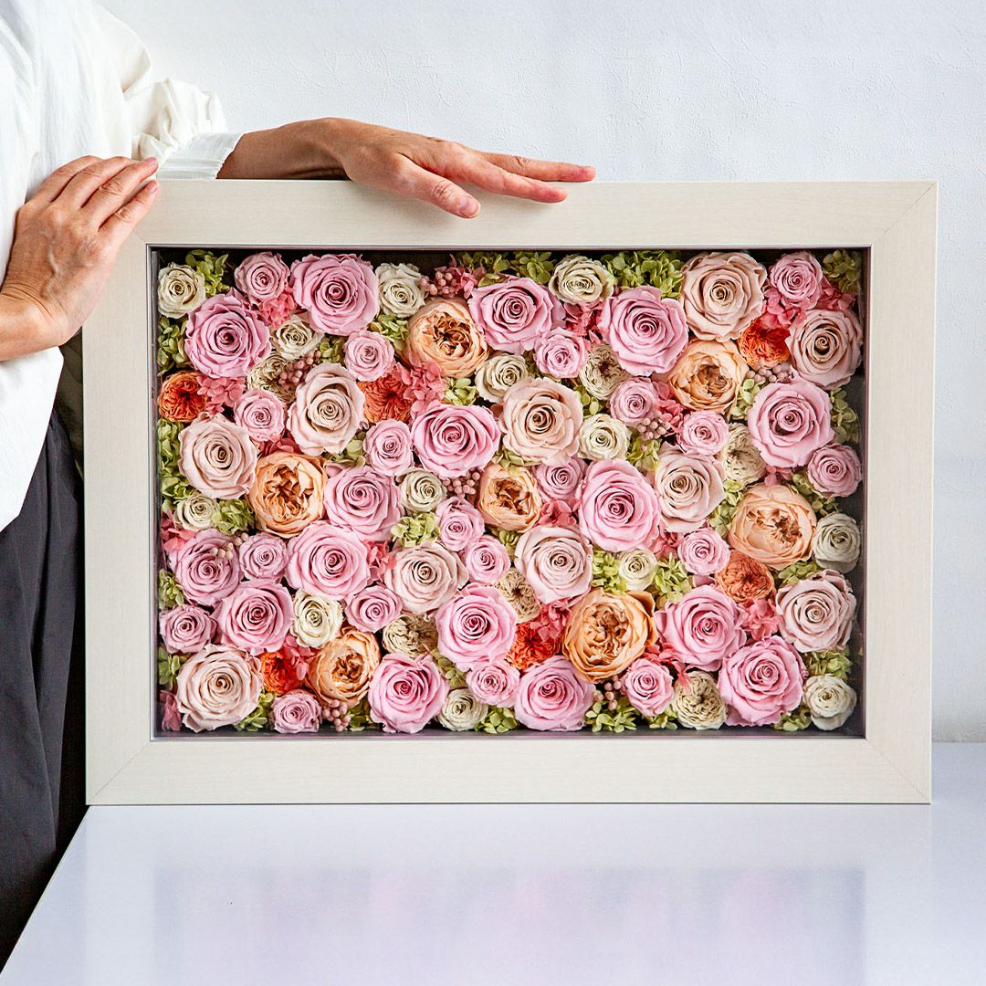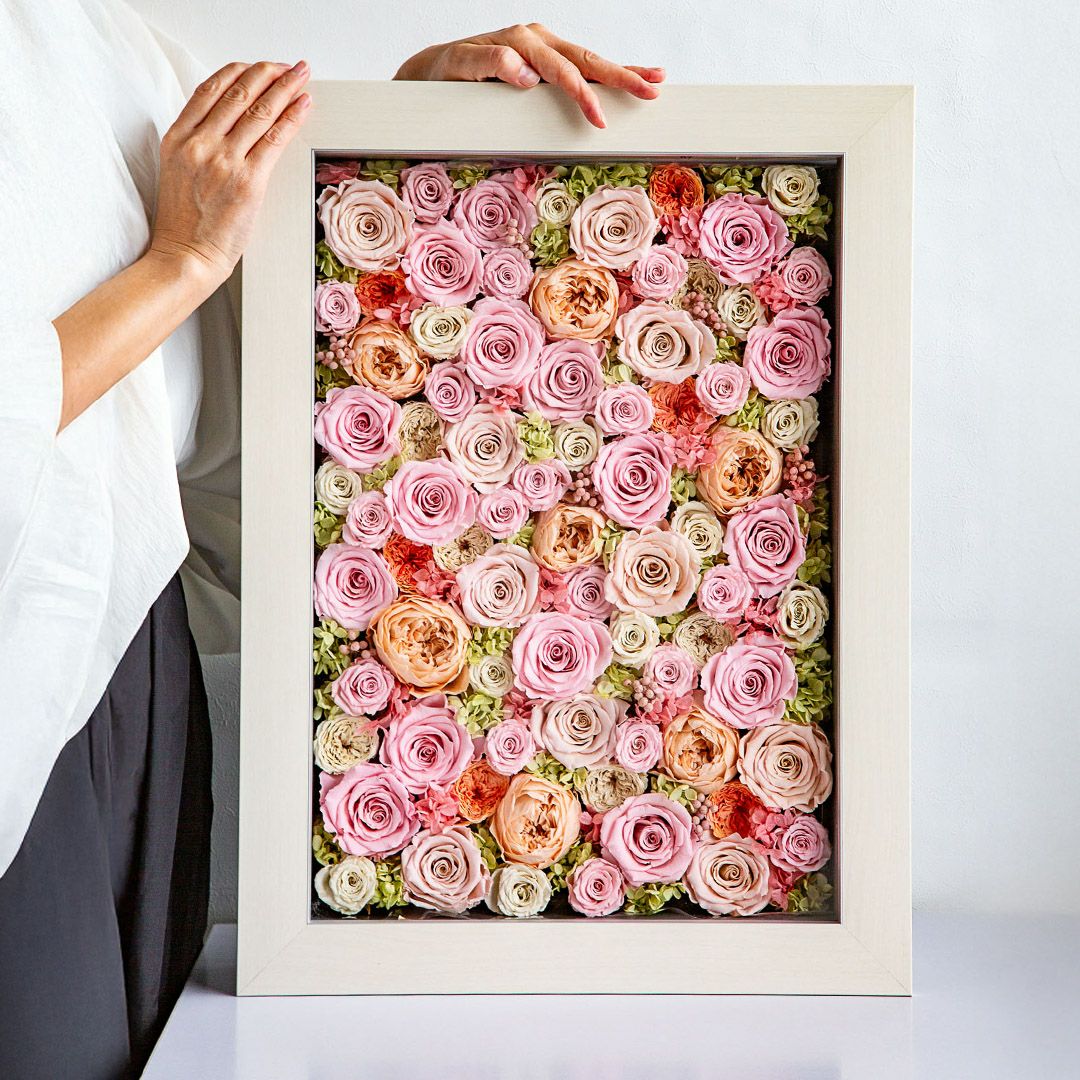 縦でも横でも飾ることができる洗練されたデザインと、高級なプリザーブドローズが贅沢に敷き詰められた豪華さが人気の理由。受付やちょっとしたコーナーなどの限られたスペースでも存在感を放ち、華やかさを演出してくれます。