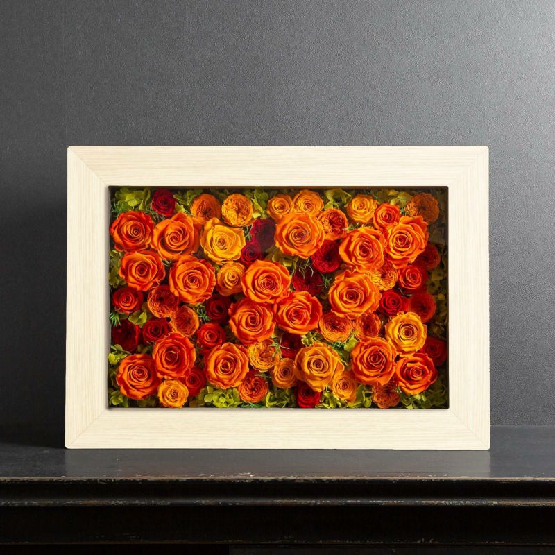 大ぶりなフレームをプリザーブドローズで贅沢に埋め尽くしました。 その様子はまさに威風堂々。一枚の絵画のように薔薇を愉しむフレームです。
