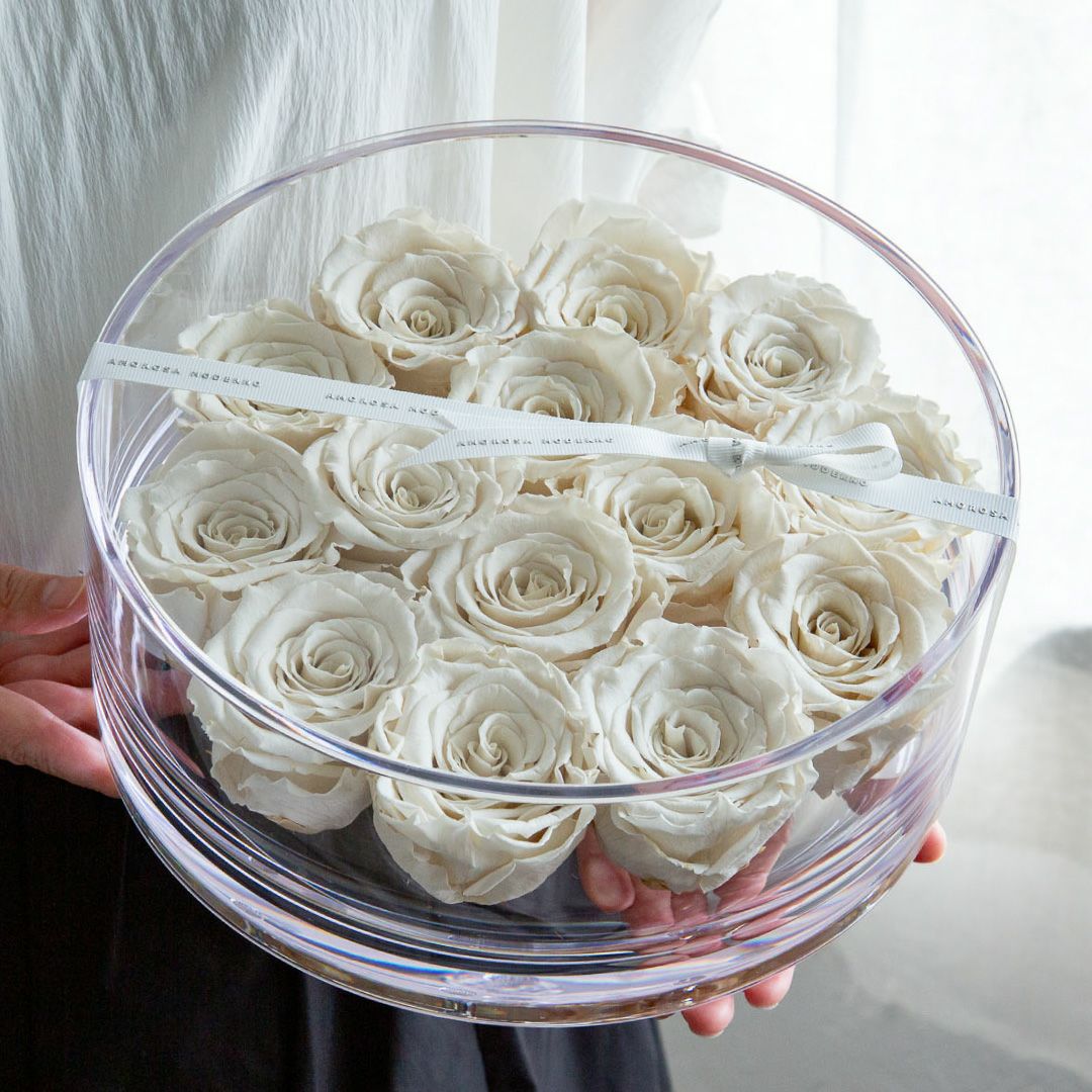 Material:プリザーブドフラワー(ローズ)、真鍮、有機ガラス、(容器)、アクリル(フタ)、リボン、化粧箱
