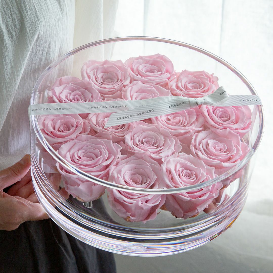 Material:プリザーブドフラワー(ローズ)、真鍮、有機ガラス、(容器)、アクリル(フタ)、リボン、化粧箱