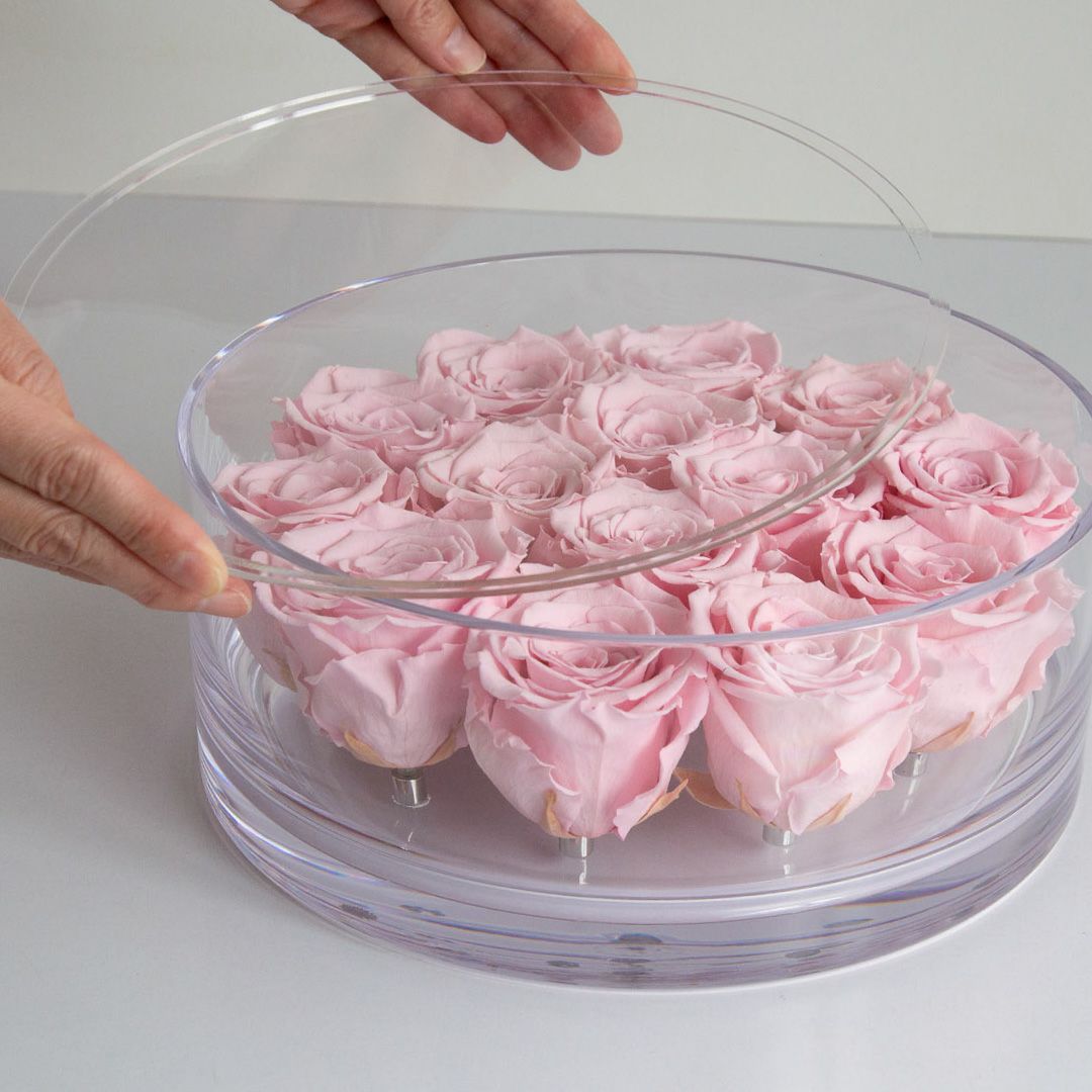 クリスタルガラスと同等の光の透過率や屈折率を持ち、ガラスの約250倍の強度がある有機ガラス(ポリカーボネート)でローズの美しさをご堪能いただけます。