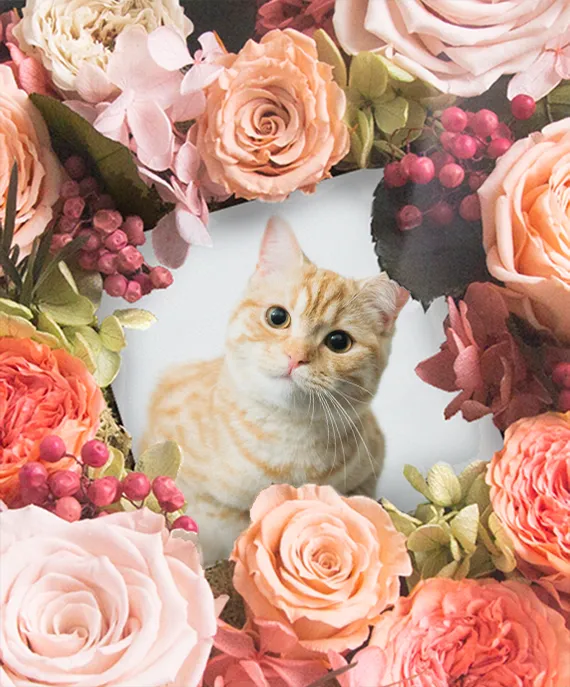 花や葉、実はすべてプリザーブドフラワー。水やりの必要もなく、横に立てても飾れるので、本棚やキャビネットにも安心して飾れます。 中央のスペースに思い出の写真を飾れば、花々に囲まれたフォトフレームに。大切なペットとの思い出を写真とともに残しませんか。