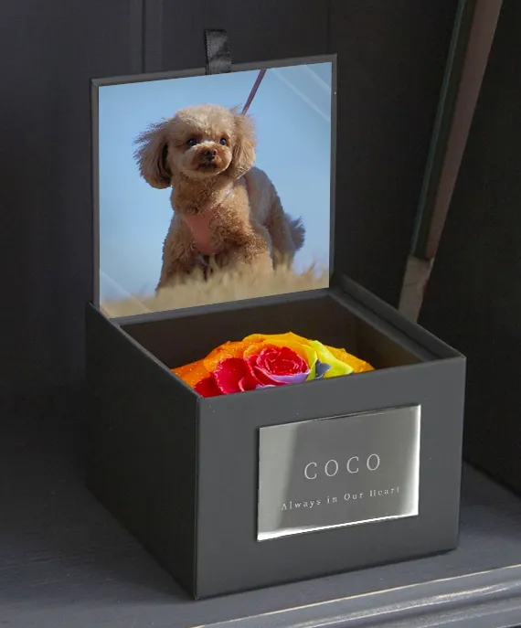 ペットが天国に向かうことを「虹の橋に向かう」といいます。フタを開けると、天然ダイヤモンドとラメが輝く虹色のバラが現れるボックス。フタ裏には愛らしいお写真を飾れます。一緒に過ごした大切な想い出をお手元に。