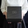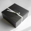 エンボス加工の化粧紙に銀の箔押しロゴが高級感を演出。厚手の紙で強度と重厚感を持たせた、特別な贈り物や記念日にふさわしいギフトボックスです。