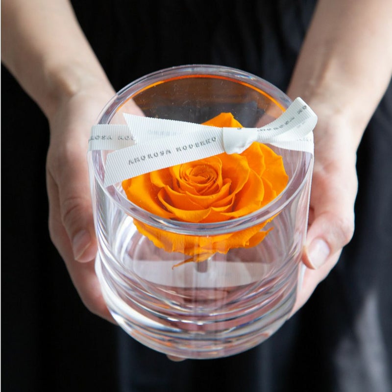 クリスタルガラスと同等の光の透過率や屈折率を持ち、ガラスの約250倍の強度がある有機ガラス(ポリカーボネート)でローズの美しさをご堪能いただけます。